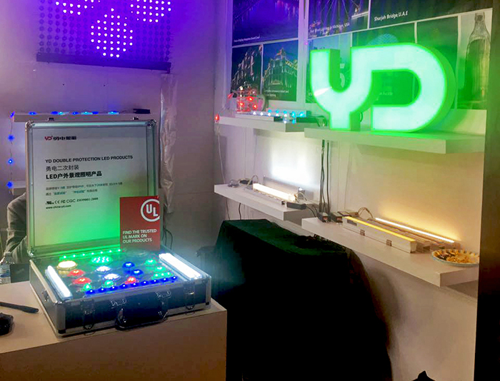 勇電照明此次采用多個(gè)展示臺(tái),展示了點(diǎn)光源、線條燈、洗墻燈、像素屏等多種LED照明產(chǎn)品。